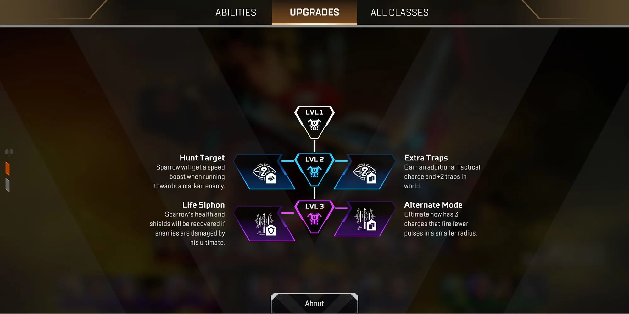 Việc nâng cấp giáp của Sparrow hoạt động giống như đối với các Legend khác. Sau khi bạn nâng cấp Khiên Evo (Evo Shield) lên Cấp 2, bạn sẽ có thể chọn một trong hai nâng cấp có sẵn. Đạt Cấp 3 sẽ cung cấp thêm một lựa chọn giữa hai nâng cấp thậm chí còn mạnh mẽ hơn.